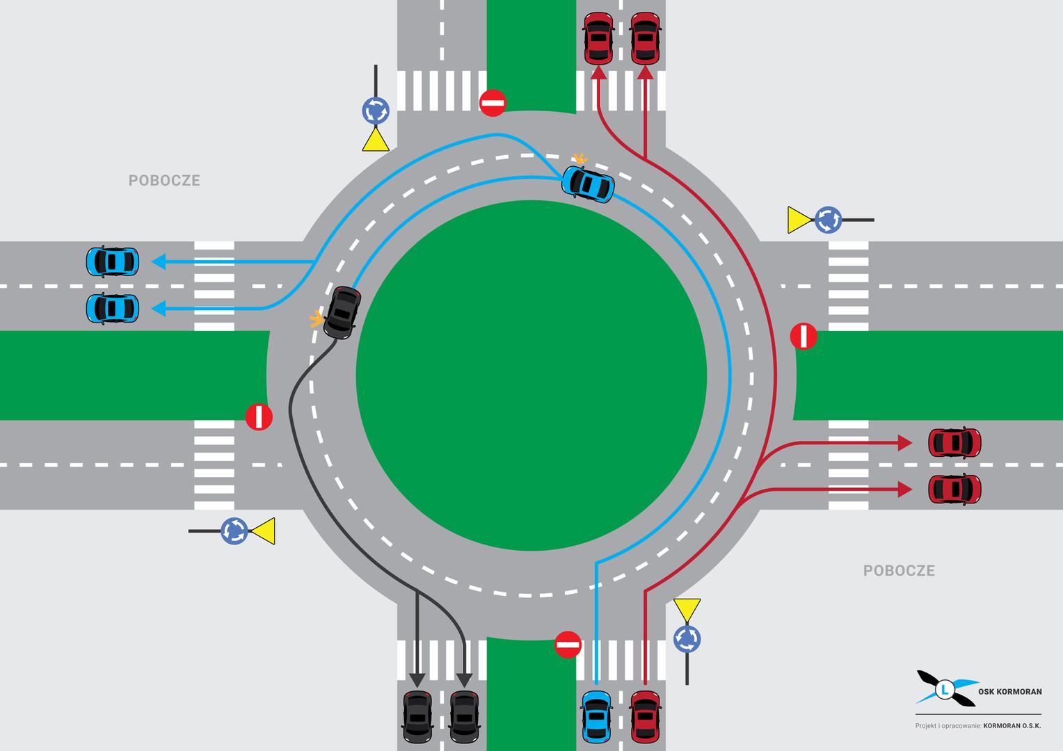 W przypadku tego ronda nie można z zewnętrznego pasa skręcać w lewo, ponieważ wcześniej znaki poziome wskazują z jakiego pasa w którą stronę można zjechać. Wcześniej ich nie było i przez to wynikało mnóstwo stłuczek.
