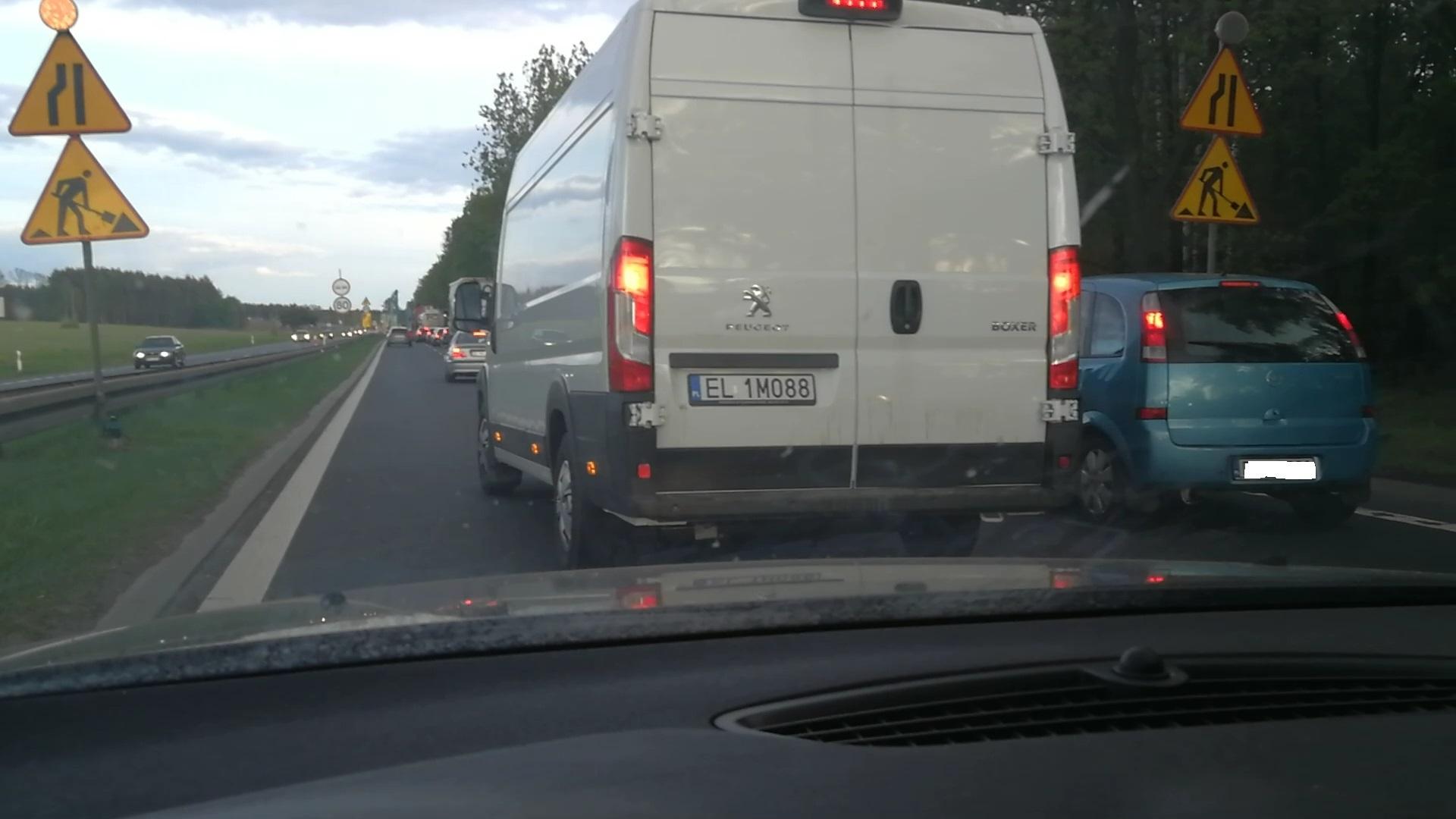 Nieznajomość zasad utrzymania płynności ruchu przy zwężeniu i jeździe "na zakładkę". Kierowca zajeżdża drogę i celowo blokuje pas. Zachowanie "szeryfa" na drodze.