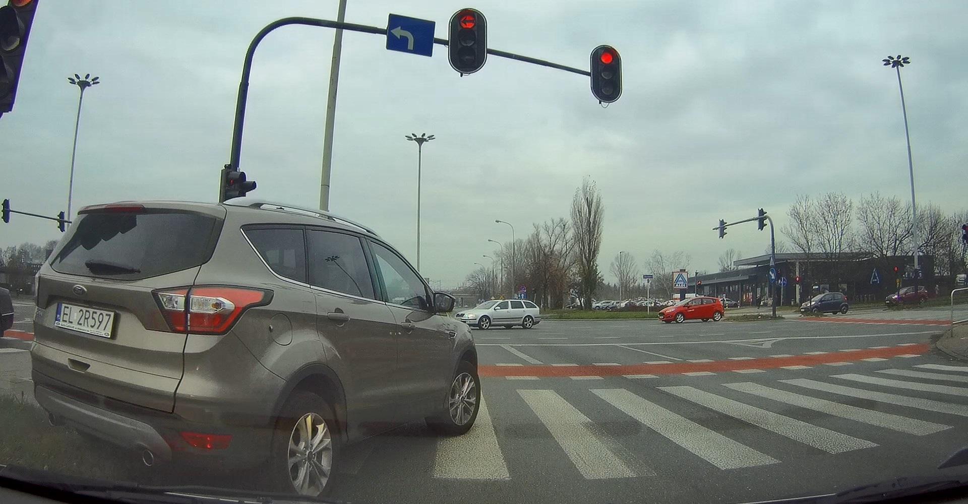 Kierowca pokazał istny popis buractwa. Najpierw ominął stojące na skrzyżowaniu na 3 pasach auta jadąc pasem zieleni, następnie skręcił w prawo ze skrajnie lewego pasa (do skrętu w lewo), rzecz jasna - na czerwonym i bez kierunkowskazu. Ech...