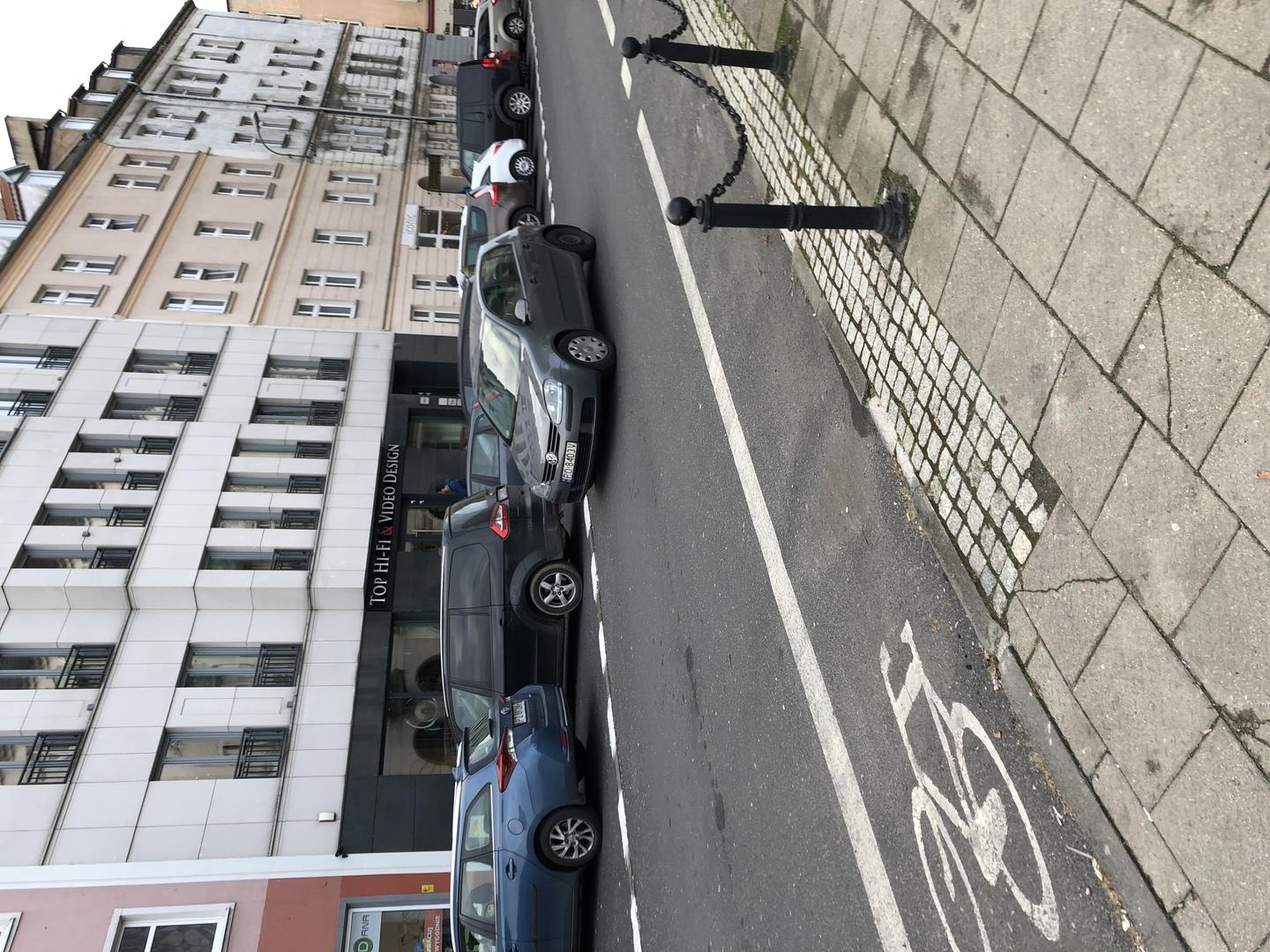 Stoi na środku drogi, utrudnia przejazd i blokuje zaparkowane samochody. 50m dalej jest pełno wolnych miejsc parkingowych. Stoi już tak od 10 minut...