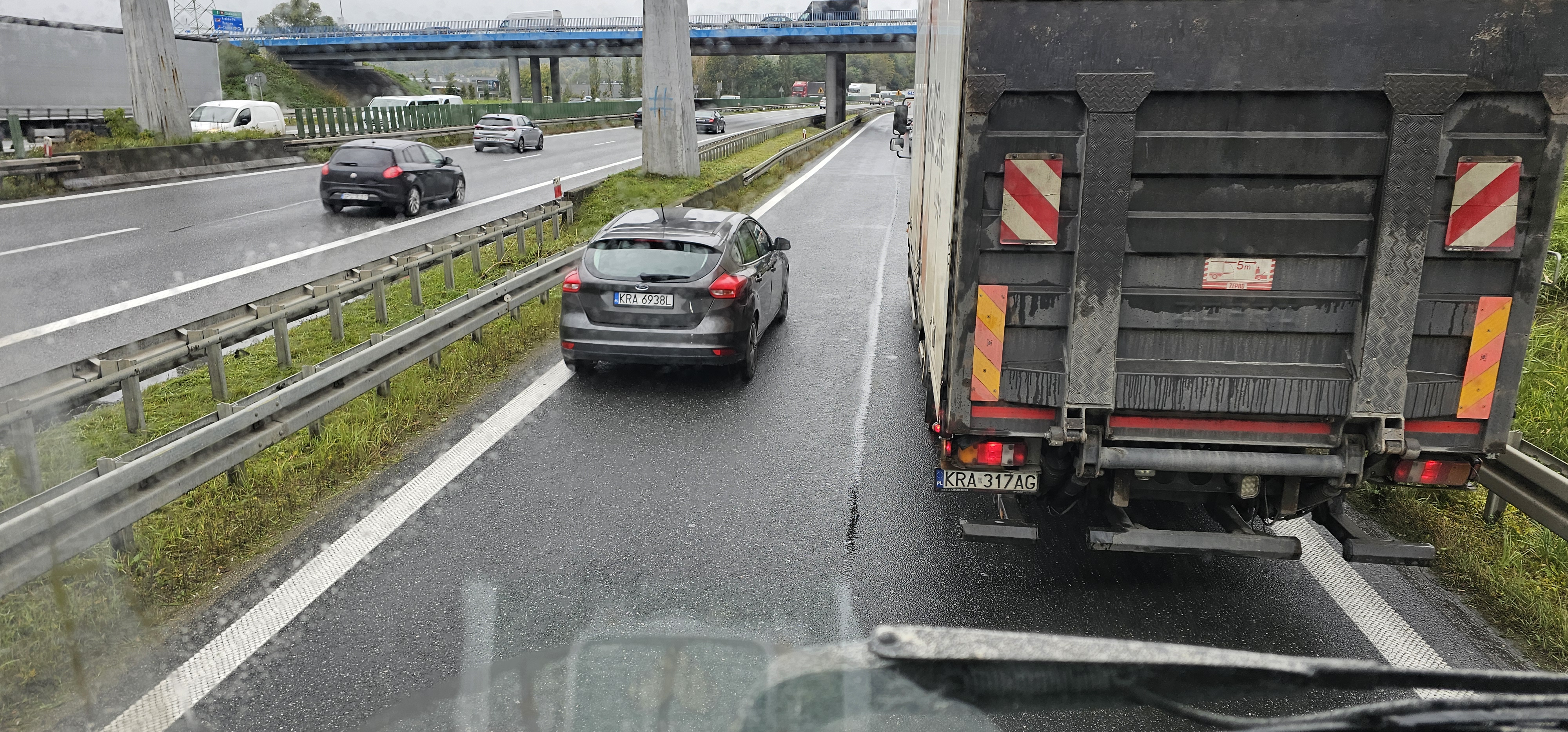 Zjeb wyprzedza cały sznur samochodów, które zjeżdżają z autostrady, a później przejeżdża przez linię ciągła, życzę Ci żeby jak najszybciej Ci odebrali prawko za taką jazdę