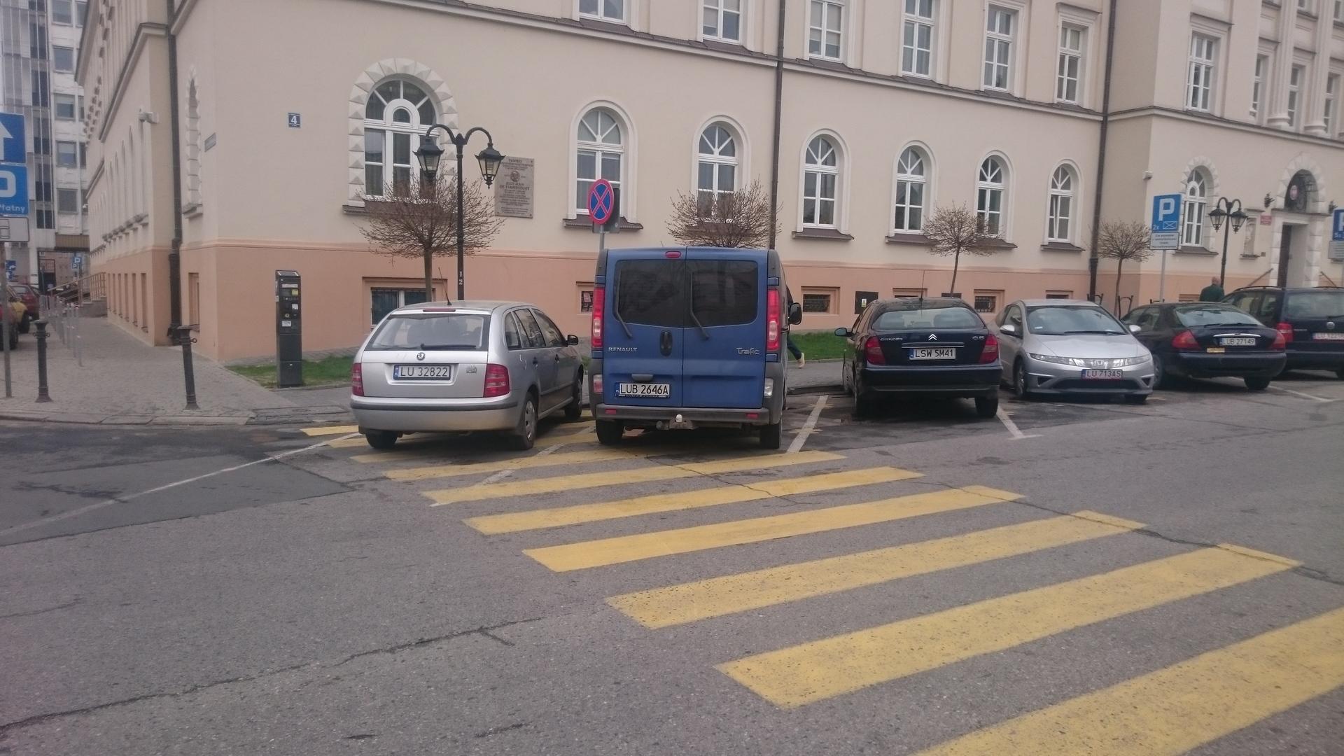 W tandemie z prywatną Śkodą służbowy Trafic jednej z podlubelskich gmin. On na pewno ważną sprawę załatwia w Urzędzie Wojewódzkim, więc ty przechodniu naucz się latać (i postaraj się nie wpaść pod samochód przy okazji).