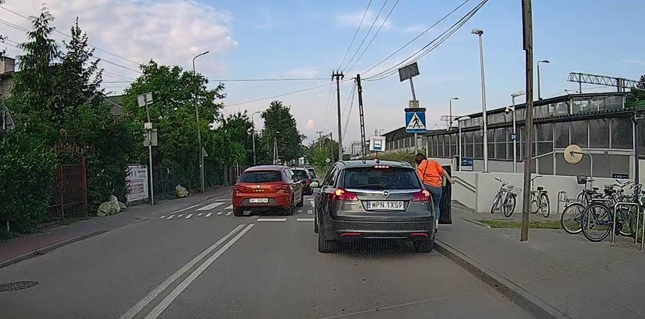 Zatrzymywanie się tuż przed przejściem dla pieszych, żeby wysadzić lub zabrać pasażera, zmuszając innych do omijania po podwójnej ciągłej. A kilkadziesiąt metrów wcześniej jest parking, gdzie można to zrobić bezpiecznie. Pasażerka wygląda na sprawną. Przejdzie ten kawałek, tym bardziej, że na peron i tak ma dłuższą drogę, na dodatek po schodach.