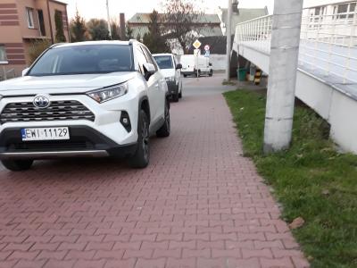 Parkowanie na chodniku i to pod prąd, bez minimalnego miejsca dla pieszych.